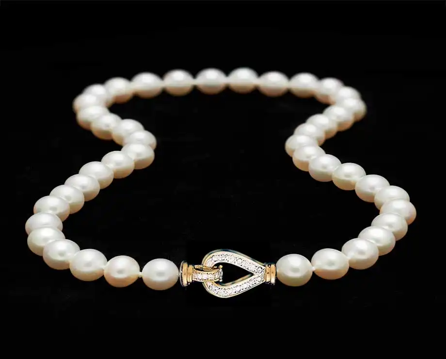 A truly glamorous piece, this Teardrop Pearl Necklace is stunning. Strung with 8mm Freshwater pearls, this pearl necklace is of the highest-quality of pearls. The interesting shape of this diamond encrusted clasp, makes for a totally luxurious pearl necklace. This Teardrop Clasp is encrusted with .40ct diamonds and comes in 14K gold. From beginning to end, this 30mm clasp is designed to bring you the most sophisticated style.