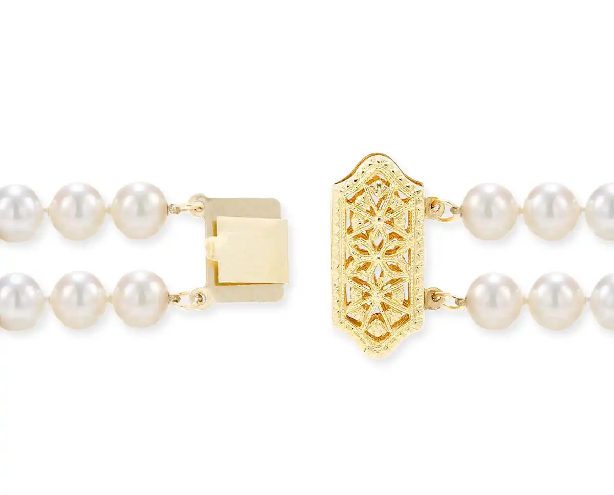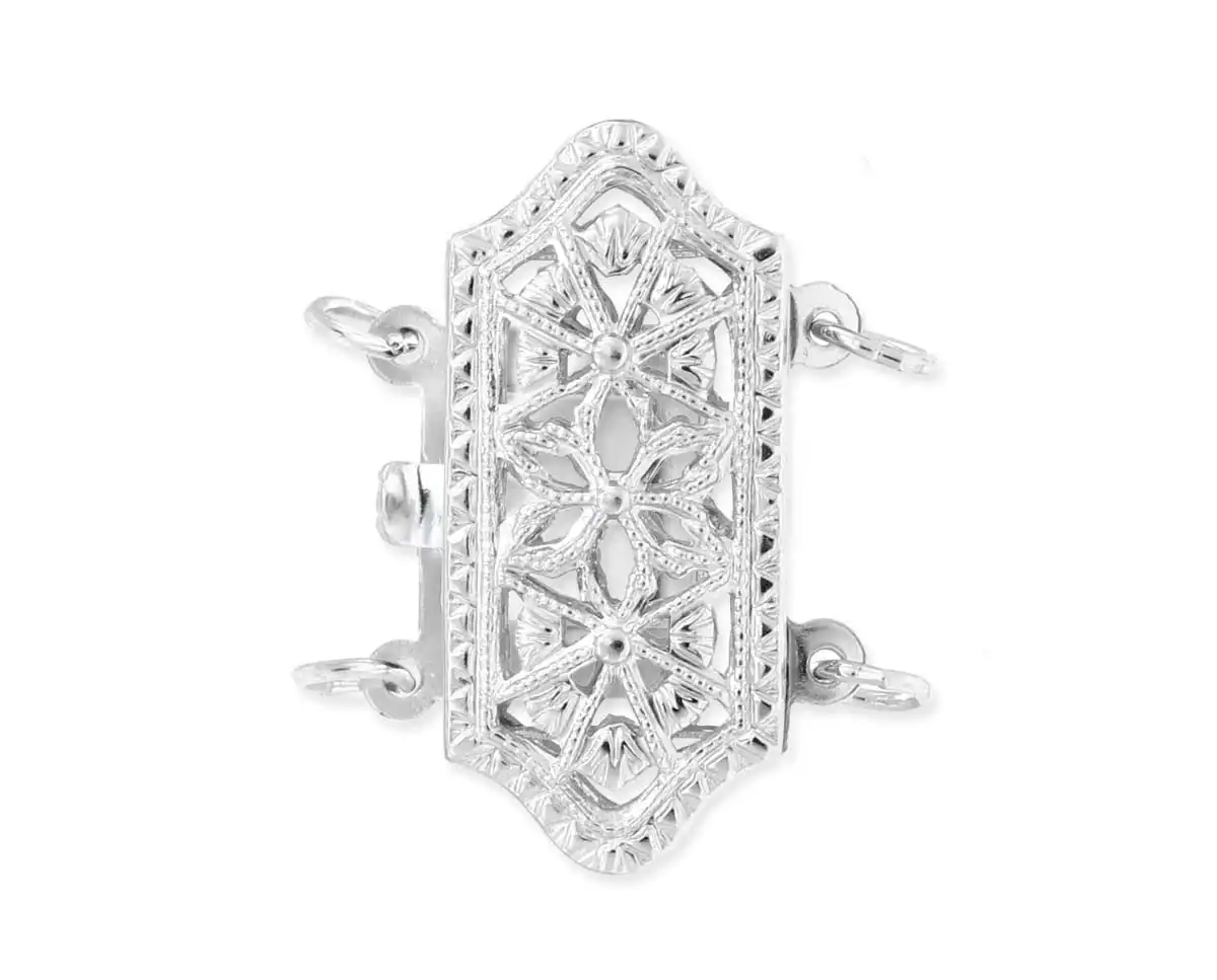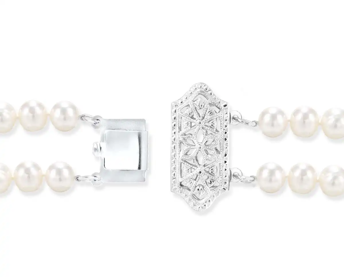 This beautiful filigree pearl clasp is available in either 14K white or yellow gold. Match it with multiple strands of freshwater pearls in the size that you like and you will have your own custom made pearl necklace.